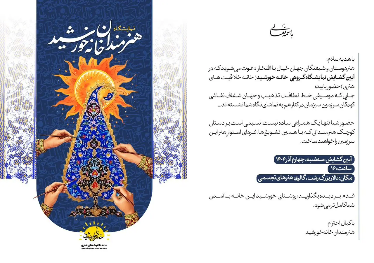 نمایشگاه گروهی آثار اساتید و هنرجویان آموزشگاه خانه خورشید روز سهشنبه ۴ آذر ۱۴۰۴ ساعت ۱۶ در گالری تالار بزرگ رشت با هدف نمایش استعدادهای هنری گشایش مییابد.